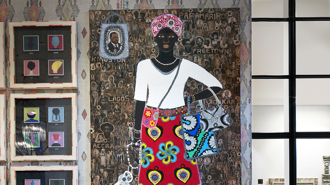 Kit demonstrates the method – and how to mix patterns in a room – by exploring her design choices in the bar at The Whitby Hotel (below). In this space, she hung Carla Kranendonk’s art, which uses large-scale, vivid brushwork against smaller photographic elements to create a strong statement piece.
