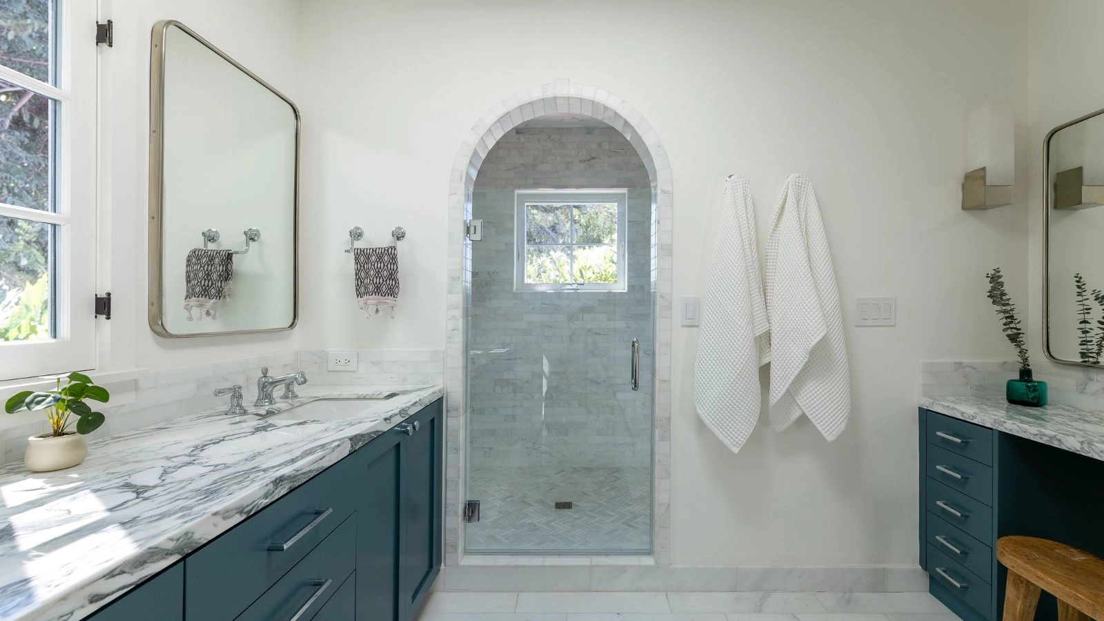 'We design built-in custom cabinetry to accommodate towels to be handy and within easy reach, and hair dryers and styling tools to be tucked away and hidden in a drawer or hanging behind a cabinet door. We always make sure to have a hidden electrical outlet included in the design so the cord doesn't need to be visible. When these things have a home or a good-looking place to land, they do not become a visual nuisance.'