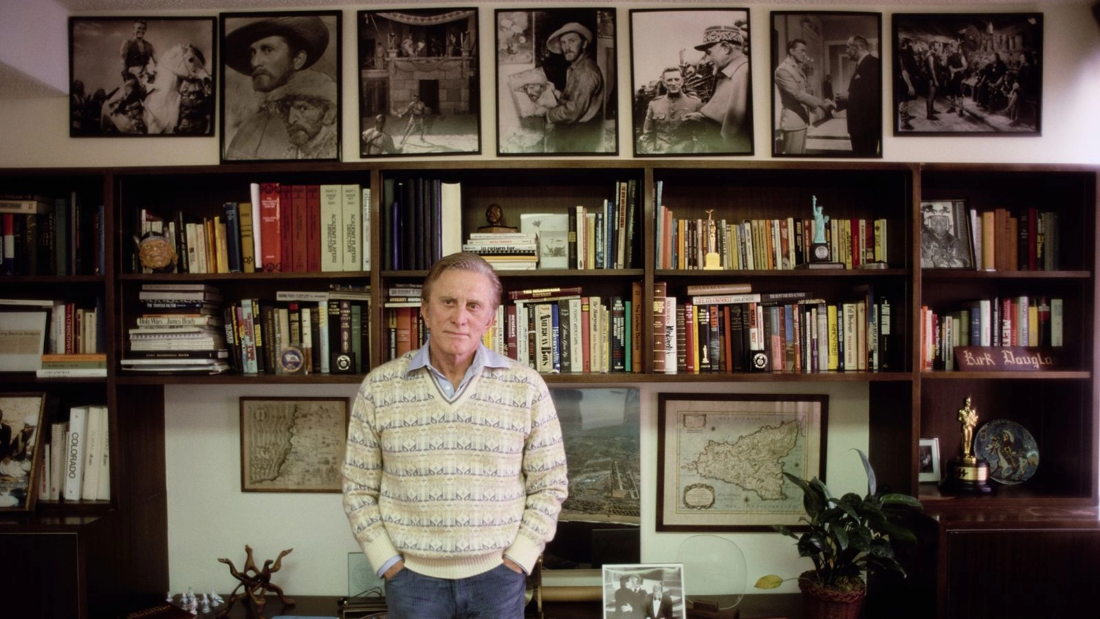 Cluttered, but Curated: Kirk Douglas' Eclectic Combination of Vertical Storage and Gallery Wall from the '80s is Still an Inspiration