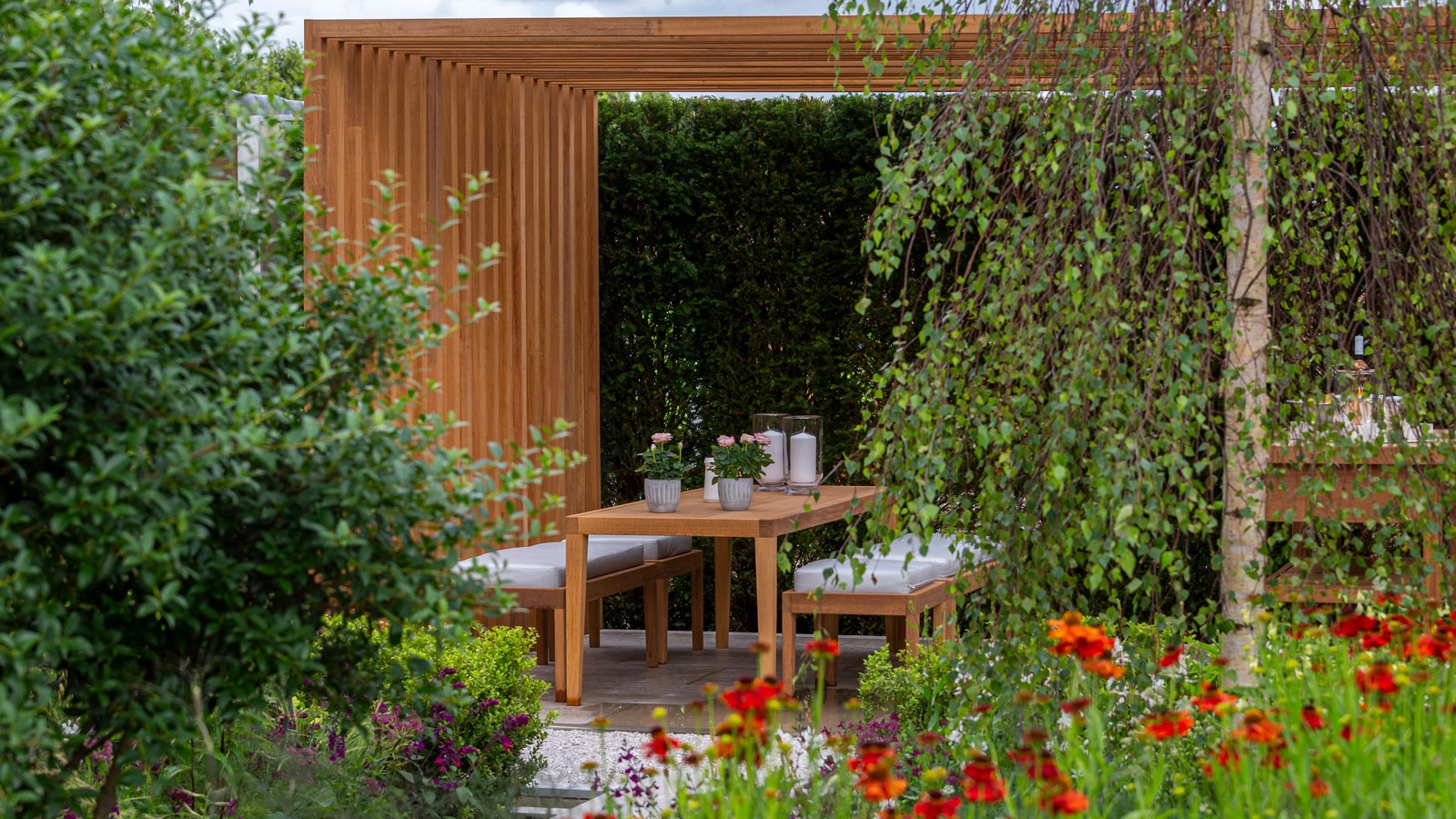 The beautiful pergola for an alfresco dining and outdoor kitchen area has been hand-crafted from the hardwood iroko in this award-winning friluftsliv garden design by Will Williams