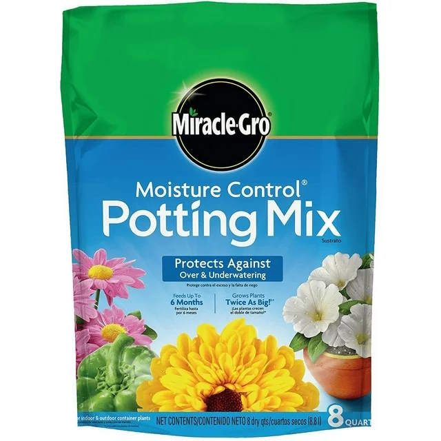 A recommended potting mix for planting sprouted carrot tops. This potting mix has added fertilizer that feeds plants for up to six months