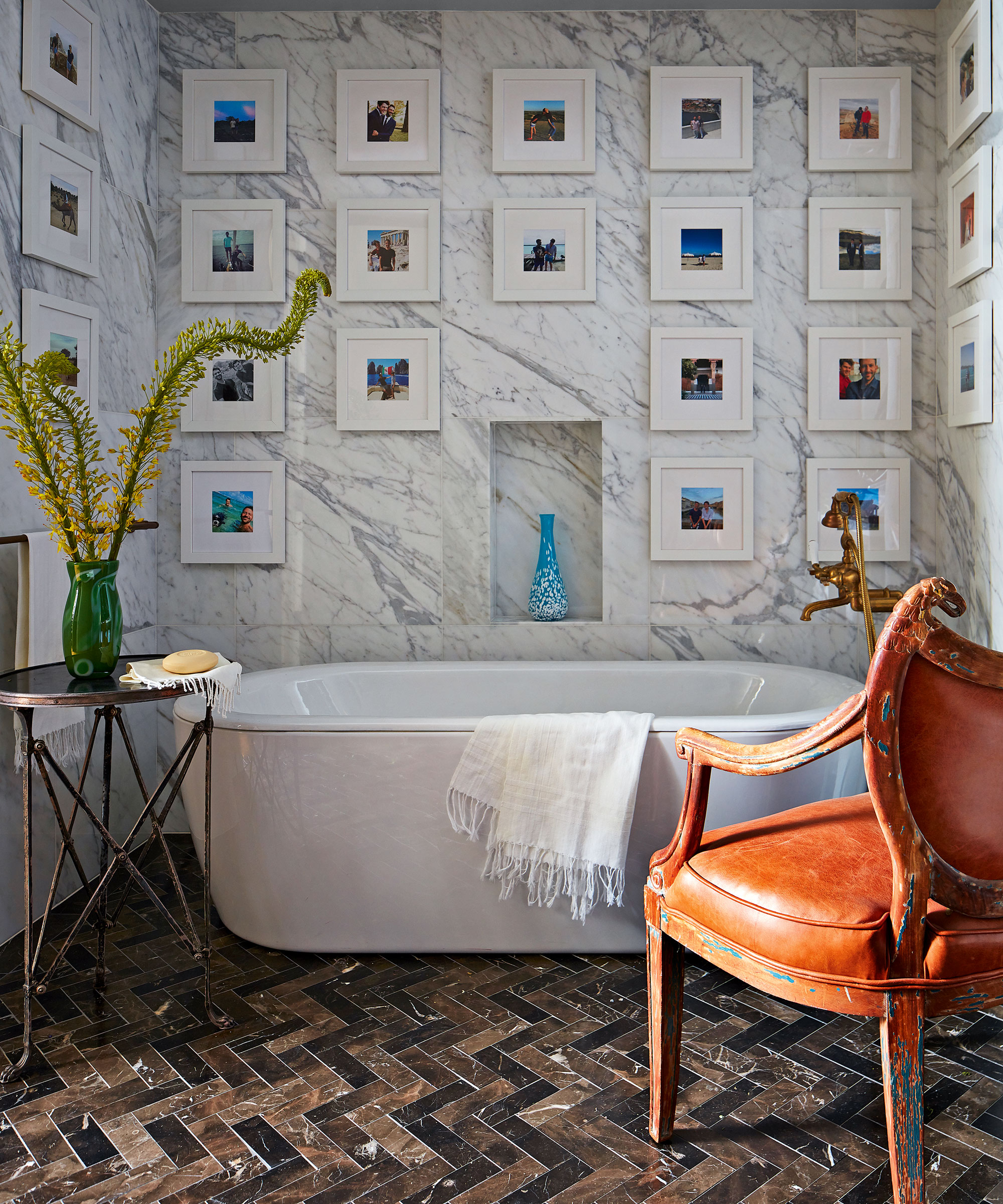 Creating a gallery wall is one of the simple but clever bathroom ideas used in the scheme. Strong adhesive was used to attach the photo gallery to the marble. The painted ceiling strikes a comforting note of enclosure.
