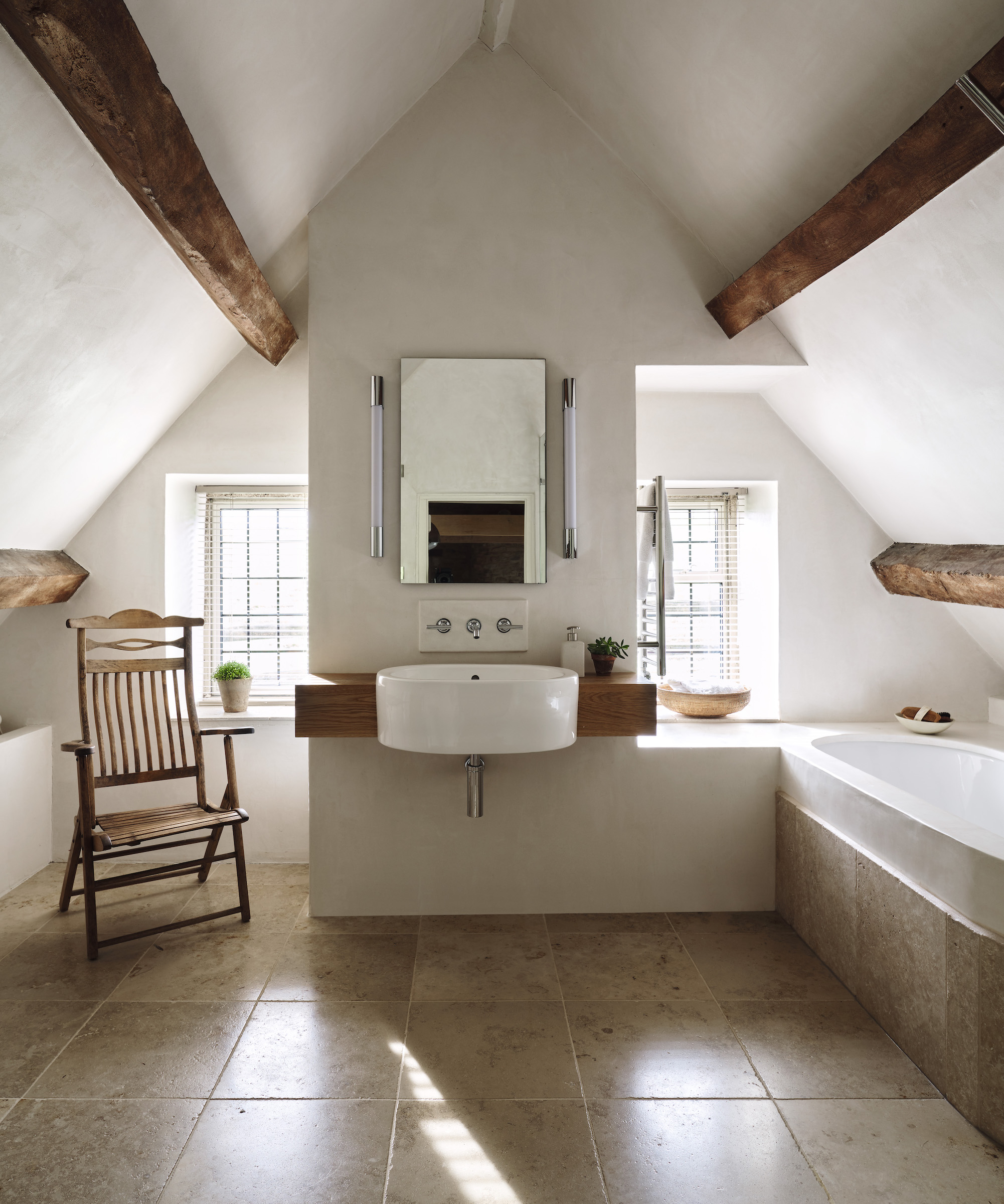 In the couple's en suite, placing the bath under the low eaves makes excellent use of the space while the same paint colour used for ceilings and walls makes the room appear larger.