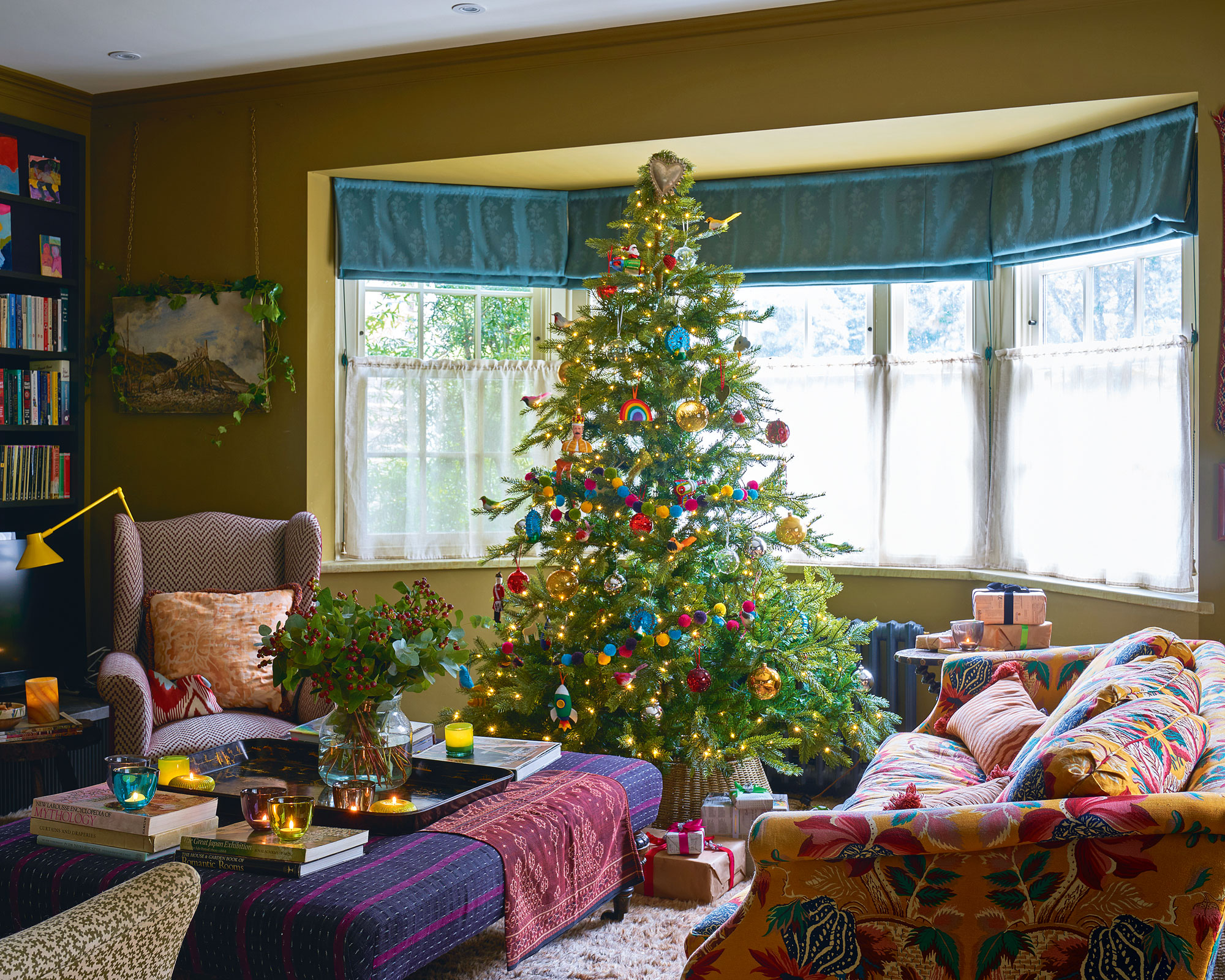 This family space, where jewel colors provide a rich atmosphere all year, is awash with living room ideas. As well as its deep dramatic paint colors such as the cozy and grounding sludgy green walls, it is layered with textures, upholstered in rich cloths and peppered with family art and antiques.