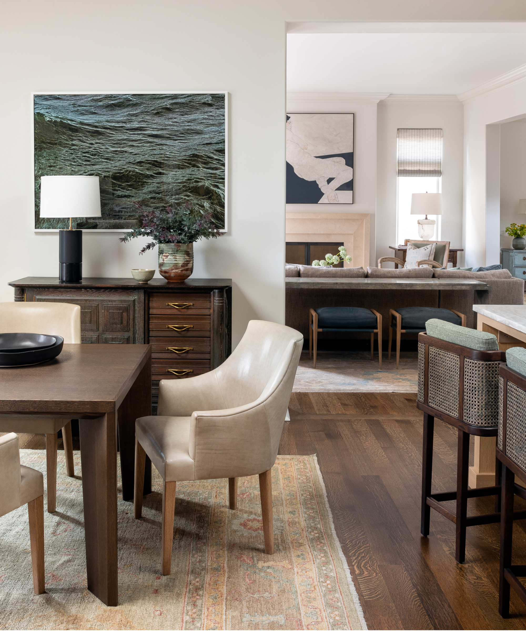 For the dining space, an Oushak rug sits underneath the oak dining table with luxurious leather armchairs.