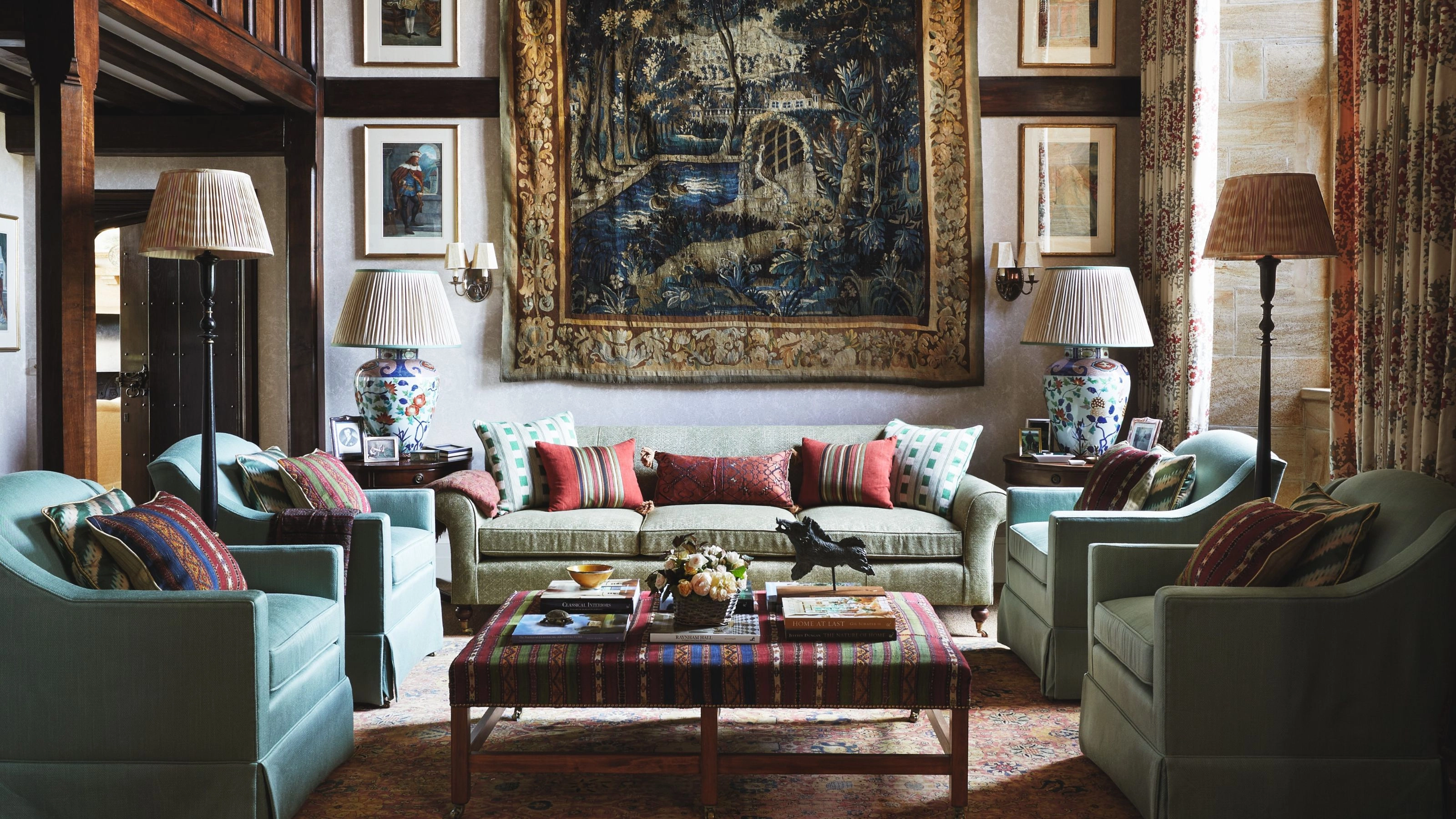 Entrance Hall (above): A tapestry hangs low to draw the eye to this sociable area. Opera wallpaper, Robert Kime. Curtains in Algiers Grey & Coral on linen, Robert Kime; made by Emma Stewart Interiors. Tapestry, Retrouvius. Sofa in Fez Weave, Guy Goodfellow Collection. Chairs in Straub Twill, Claremont. Lamps, Vaughan. Shades, Nushka. Floor lamps, Robert Kime. Rug, auction find. Cushions, VSP Interiors.
