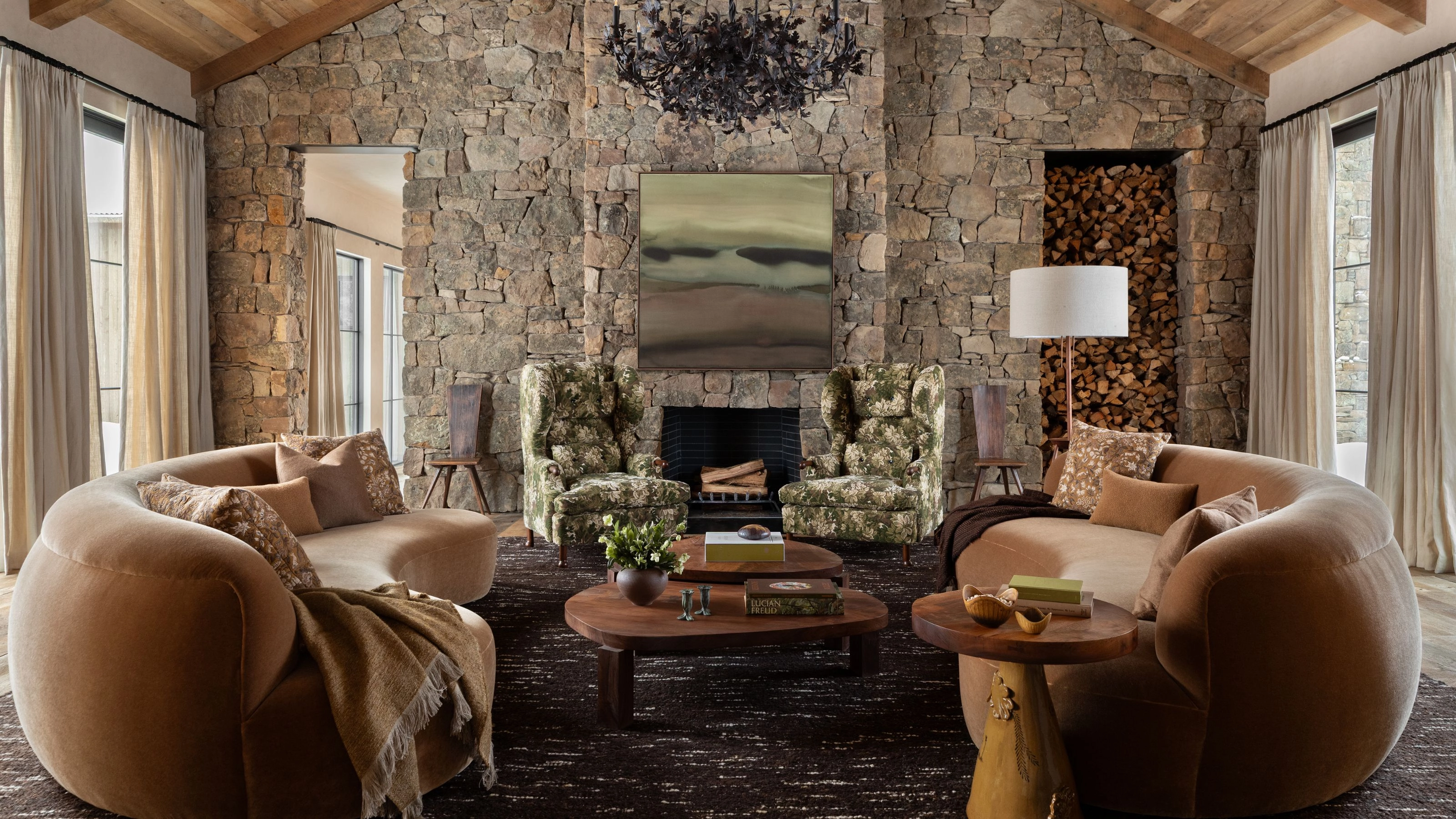 Great Room: A floor-to-ceiling fireplace anchors the great room, while upholstered lounge chairs in a tapestry print nod to the surrounding landscape.