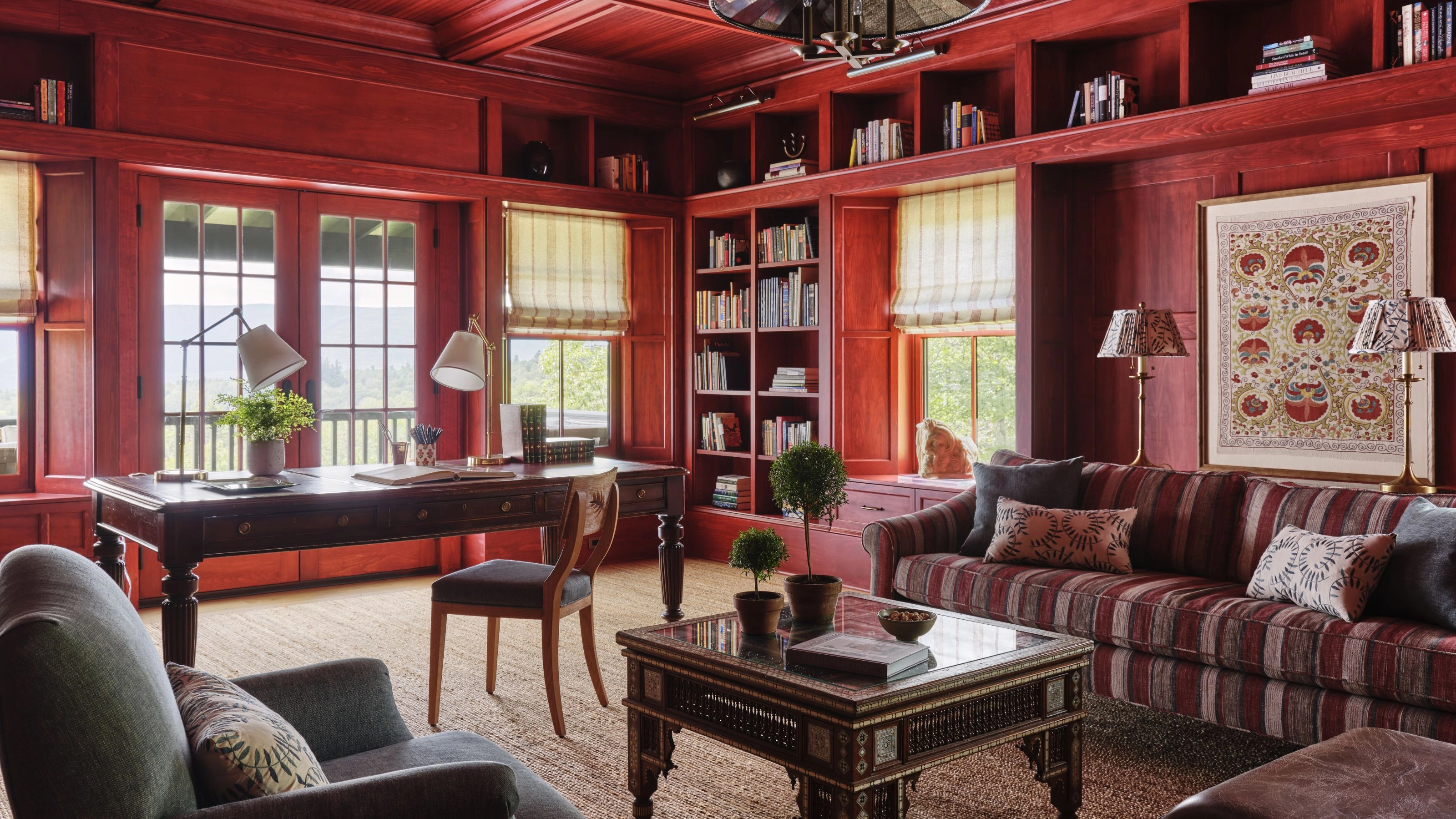 'Initially, we considered painting the library red, reminiscent of her former London home, but Lichten Architects wanted to avoid painting the knotty pine to preserve the warmth and beauty of the wood grain. Instead, we chose a rich red stain that gives the room depth and character,' she explains.