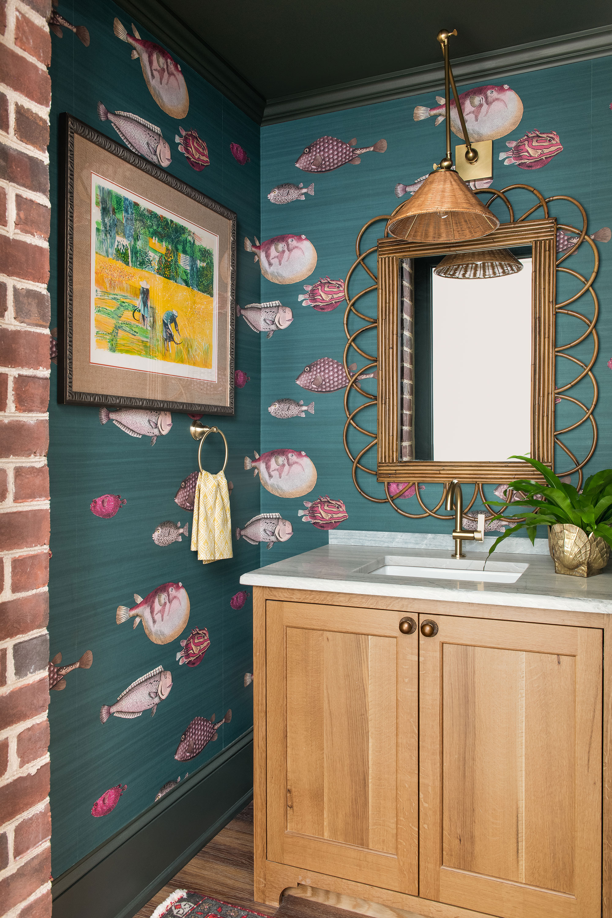 'I wanted a paper that was dramatic, but dark, so the fish imagery paired well with natural elements of rattan and bleached wood,' says Isabel. 'The countertop has soft blue veining that mimics a tide.'