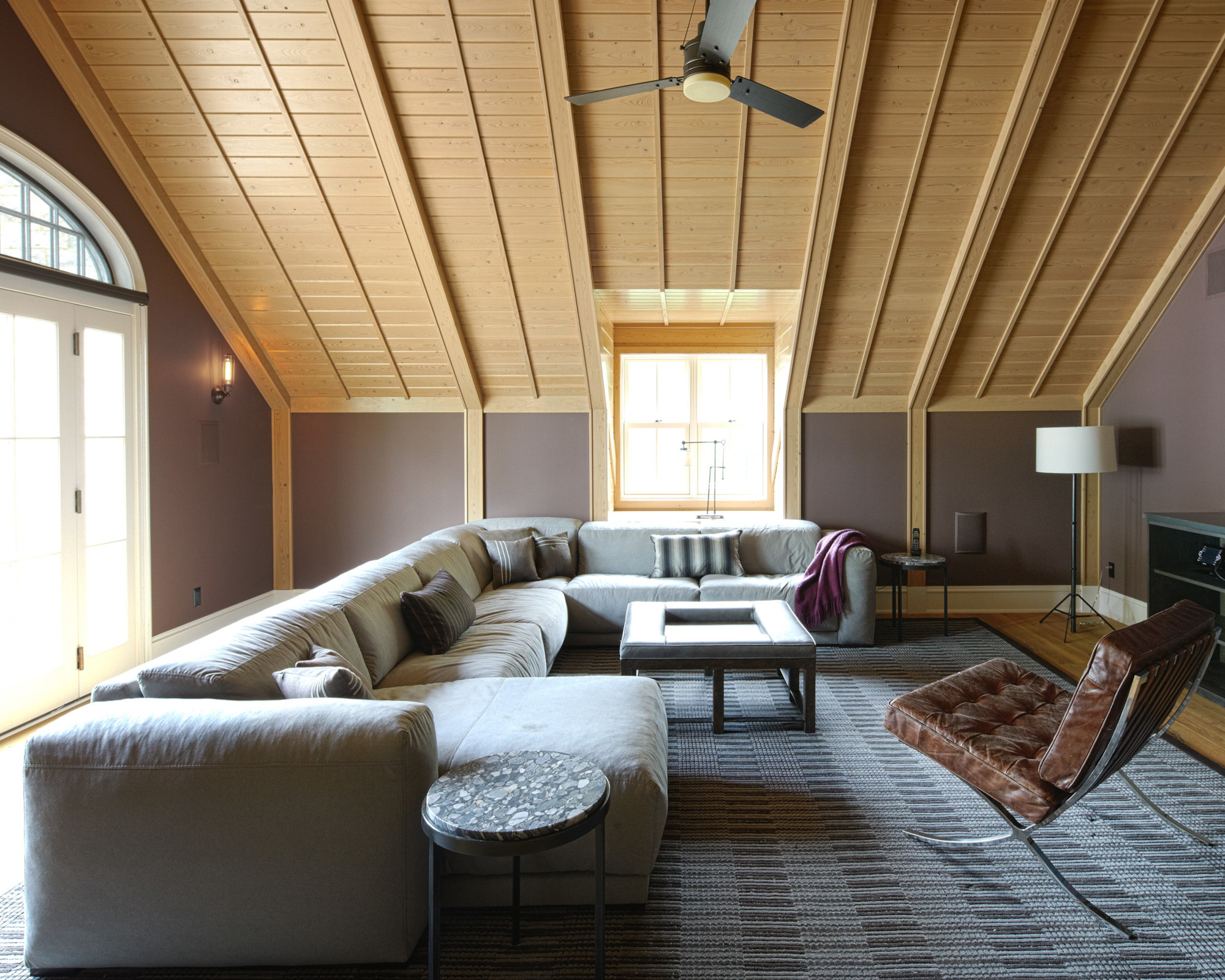 This casual hangout space, accessed by the catwalk, features a large sectional sofa that provides ample seating. Tables, including a custom Bausman & Company coffee table, are strategically positioned to ensure there's always somewhere close at hand to place drinks.