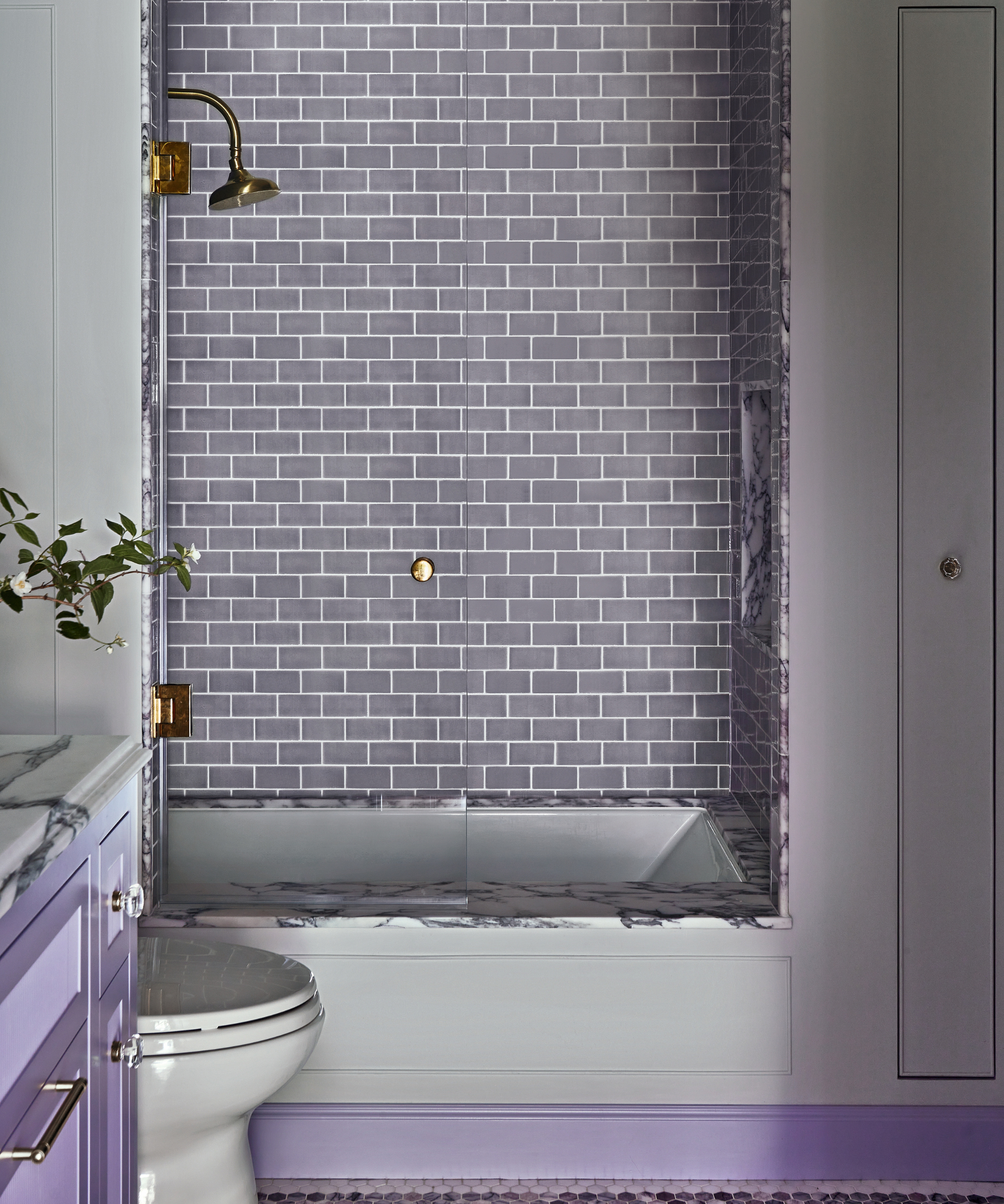 Provençal tiles in Gris, Ann Sacks. Brassware, Waterworks. Calacatta Arabescato marble, Pietra Fina.