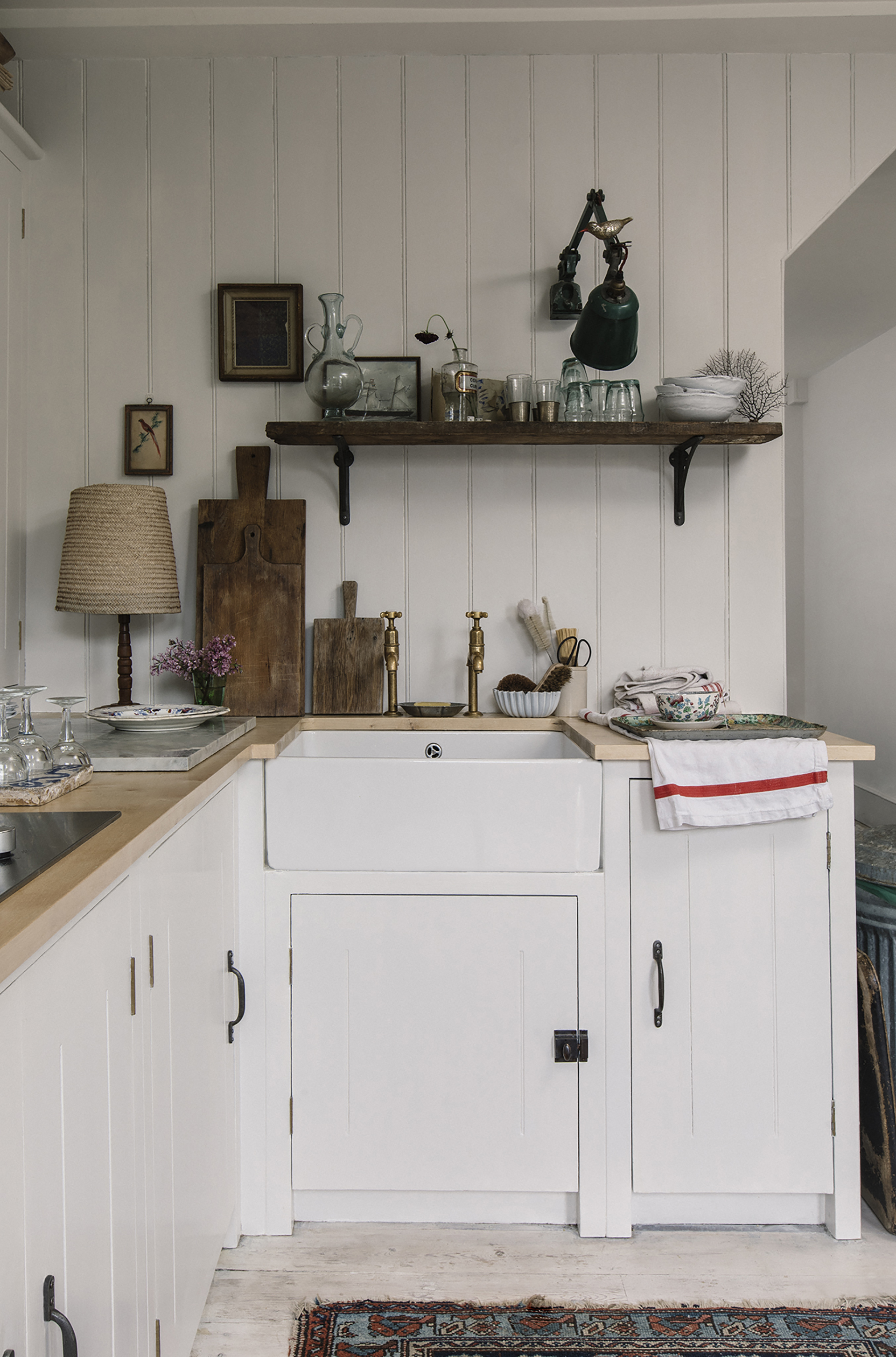 As for cabinetry styles for cottage kitchens, traditional is the route to take. Look for raised panels with decorative detail or try the verticals created by beadboard designs (also known as tongue and groove), or more intricate open grate doors. As well as fitted cabinetry, consider freestanding furniture for displaying china and more.