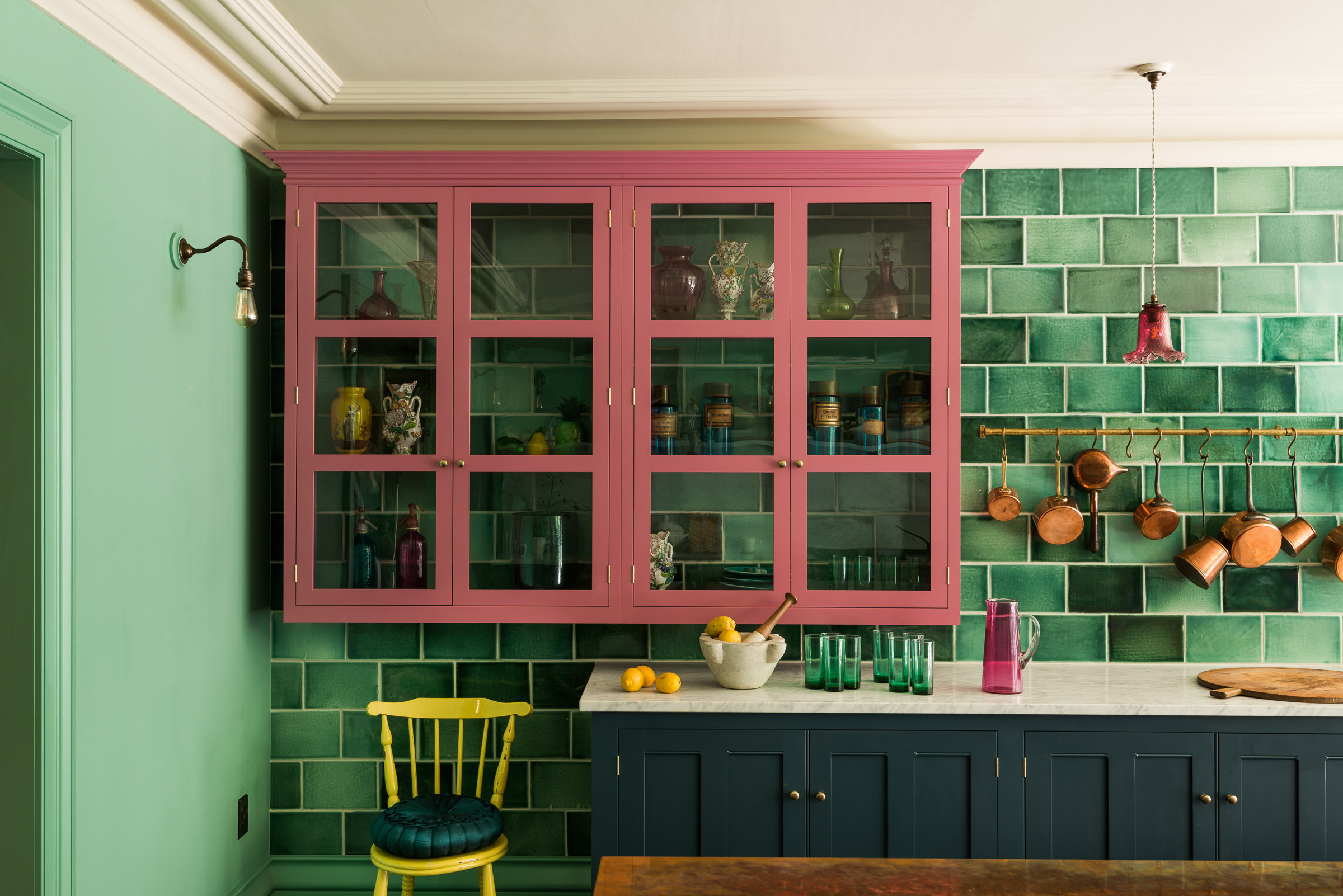 Why stop at installing a backsplash? Tiles are an amazingly practical surface for kitchens, so consider covering entire walls with your favorite tile, not just around the sink and cooking area. Wall tiles are easy to maintain, hygienic and can create a serious style statement when used in statement block colors. These handmade ceramic tiles in Emerald Green (part of a kitchen in the Lower East Side of Manhattan in New York) add a fresh and spirited backdrop against the deep pink and navy blue cupboards.