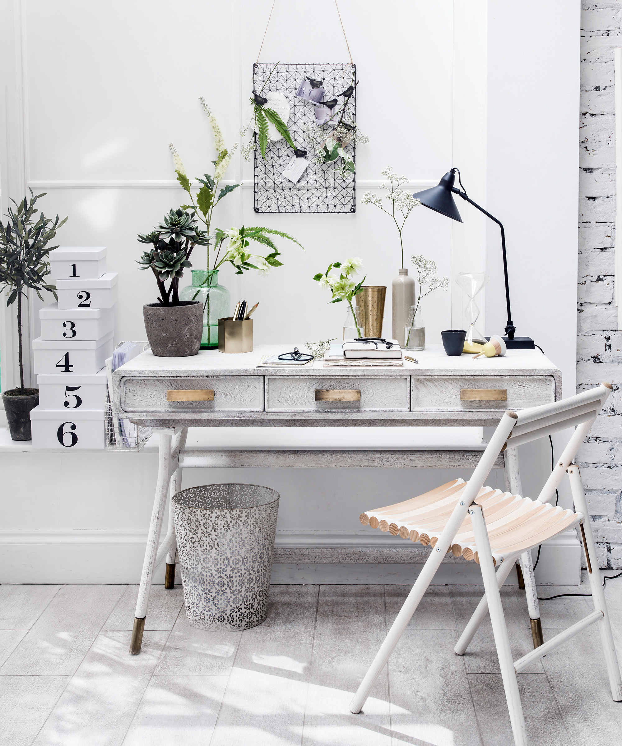 In this study area, a palette of white, soft greens and grays, natural textures and an artful use of flowers and foliage combine beautifully for a summer scheme that blends indoors and out.