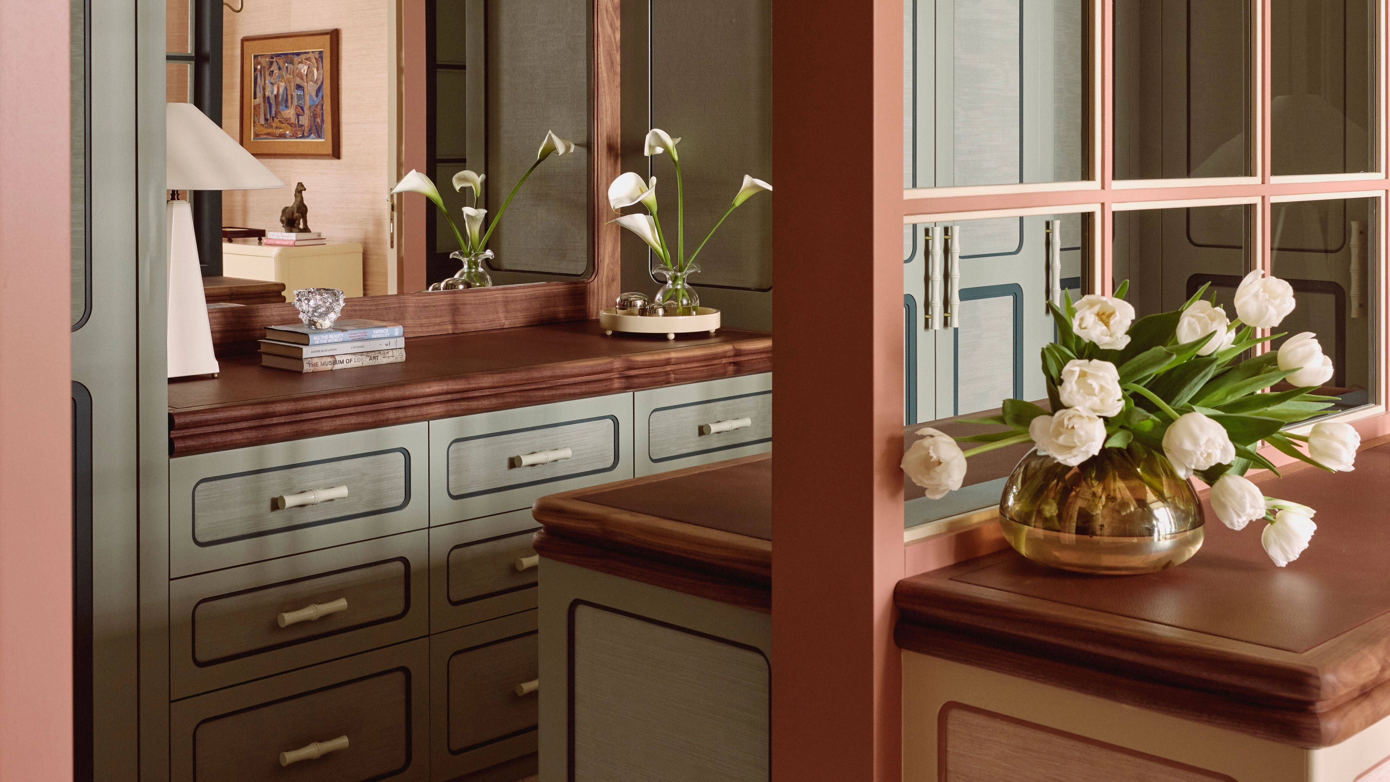 It always circles back to the hybrid – Claire's quietly genius home office–meets–dressing room. Not just for its practicality, but for its poetry. A single pane of windowed glass, balanced above a bespoke dresser, becomes the mediator between two worlds: one buttoned-up, one undone.
