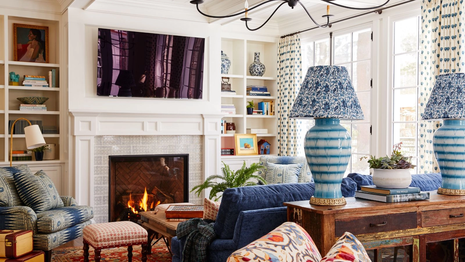 Interior designer Katie Rosenfeld placed a vintage wooden console table behind the blue sofa in this living room, flanked by two large table lamps.