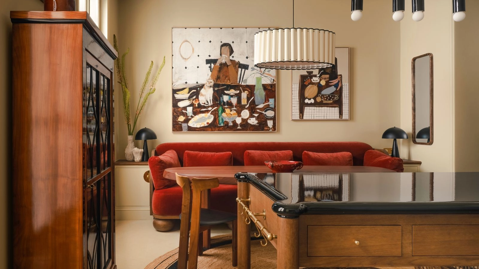 In the dining room of this project by Of Place Studio, rich greens, natural wood, brown-patterned drapery and a pop of terracotta on the light enhance the richness of the dark wall color