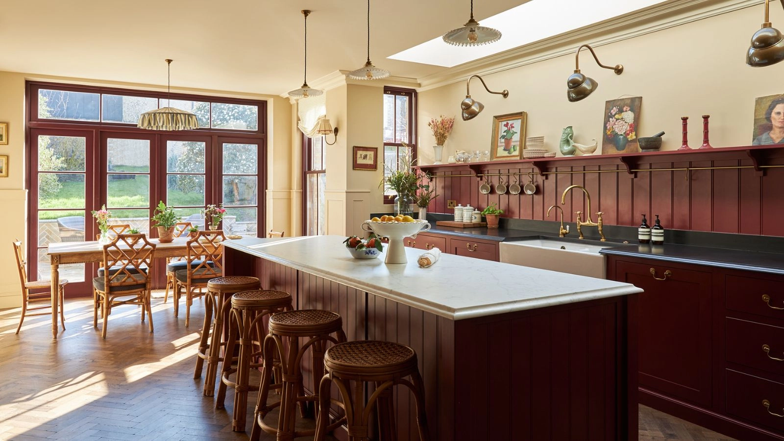 Oxblood cabinetry pairs beautifully with a warm neutral on the walls. It feels layered, inviting, and utterly lived in.