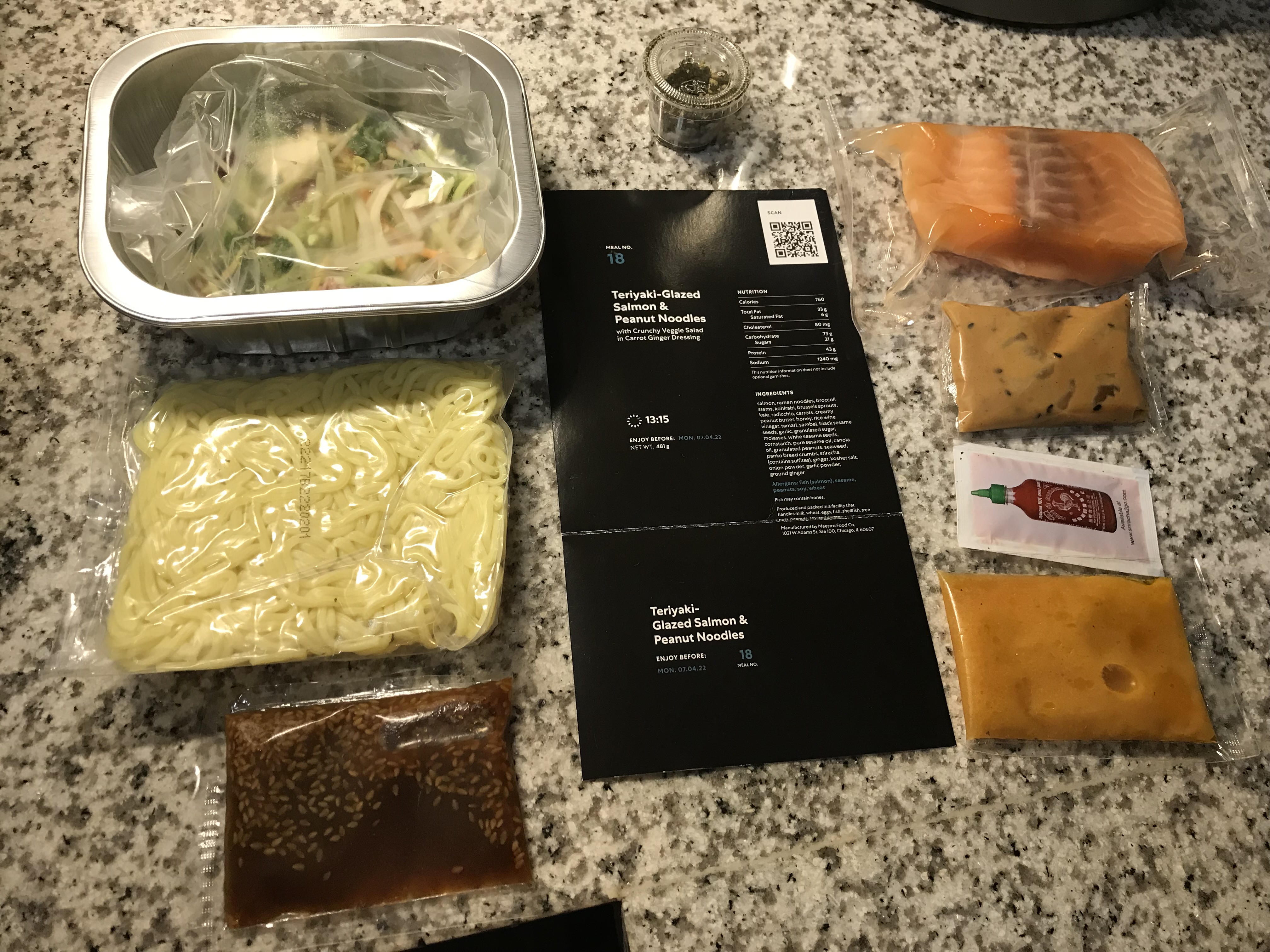 The next day, I tried another one of the Tovala Meals: Teriyaki-Glazed Salmon & Peanut Noodles. This box contained many more items than the first meal. In addition to the salmon filet, noodles, peanut sauce, and Sriracha sauce, it also included a prepared salad and carrot ginger dressing. I opened everything, poured the sauce over the salmon, placed the salmon and noodles in separate pans, placed them in the oven, and then scanned the barcode on the meal card.
