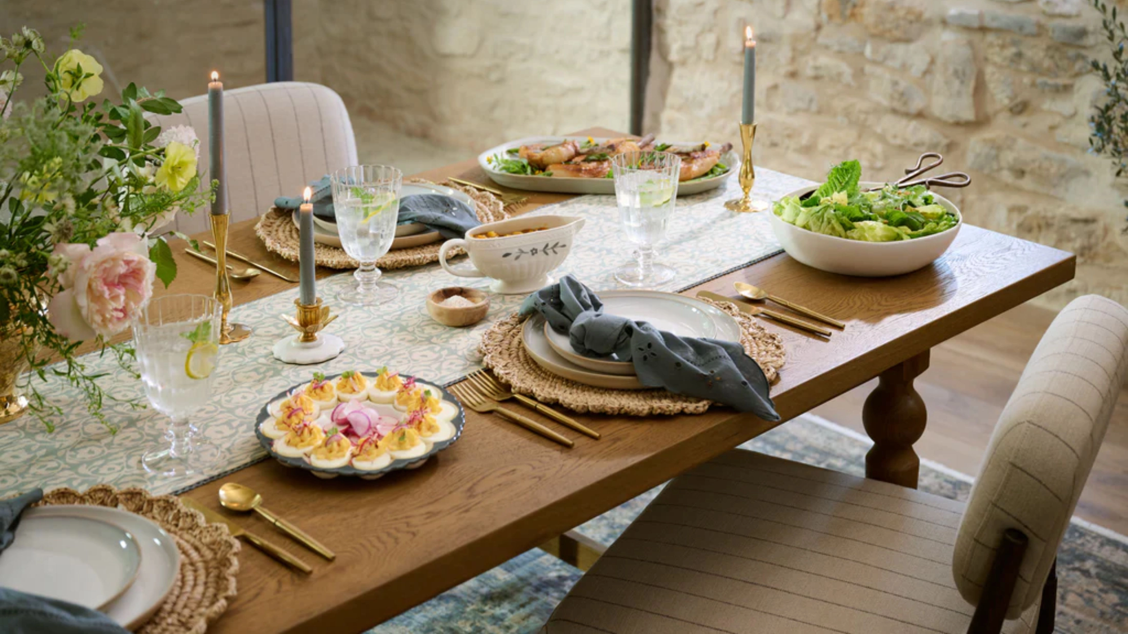 Blackened metal accents are severely underrated – but if you haven’t noticed the current wrought-iron revival, they’re very much having a moment this season. Here, the finish helps temper the ornate, antique-inspired silhouette, making it feel more relaxed for everyday tables. Try adding a soft yellow taper to nudge the whole look into spring.