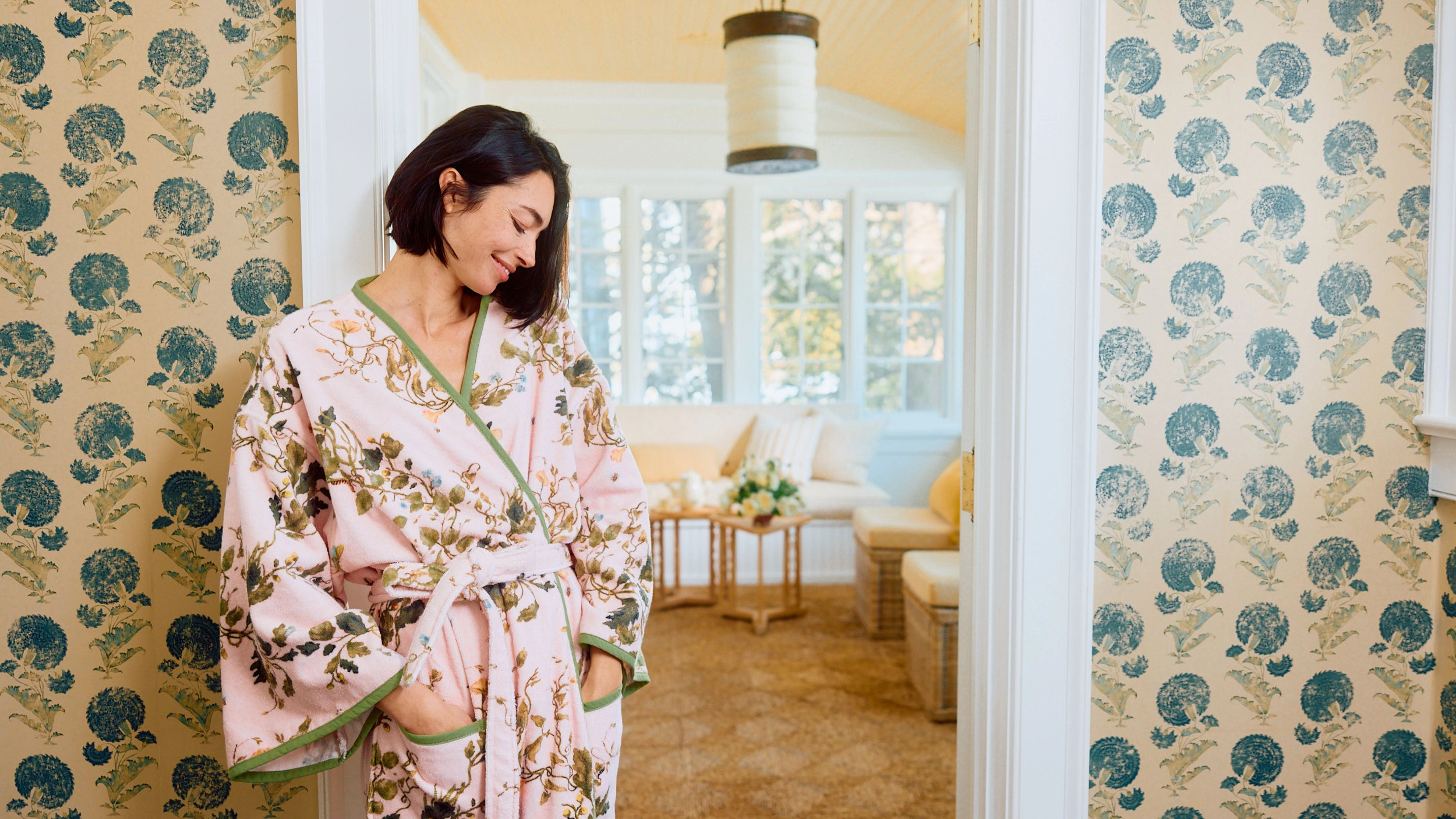 ‘I’d describe it as playful, polished, and rooted in a kind of relaxed California prep,’ Leah says of the collaboration, floating in buttery yellows, powder blues, and botanical greens. ‘There’s a lightness to it: florals that feel fresh rather than formal, colors that are cheerful but still classic. They’re meant to feel happy and easy in a home – something you can live with every day.’