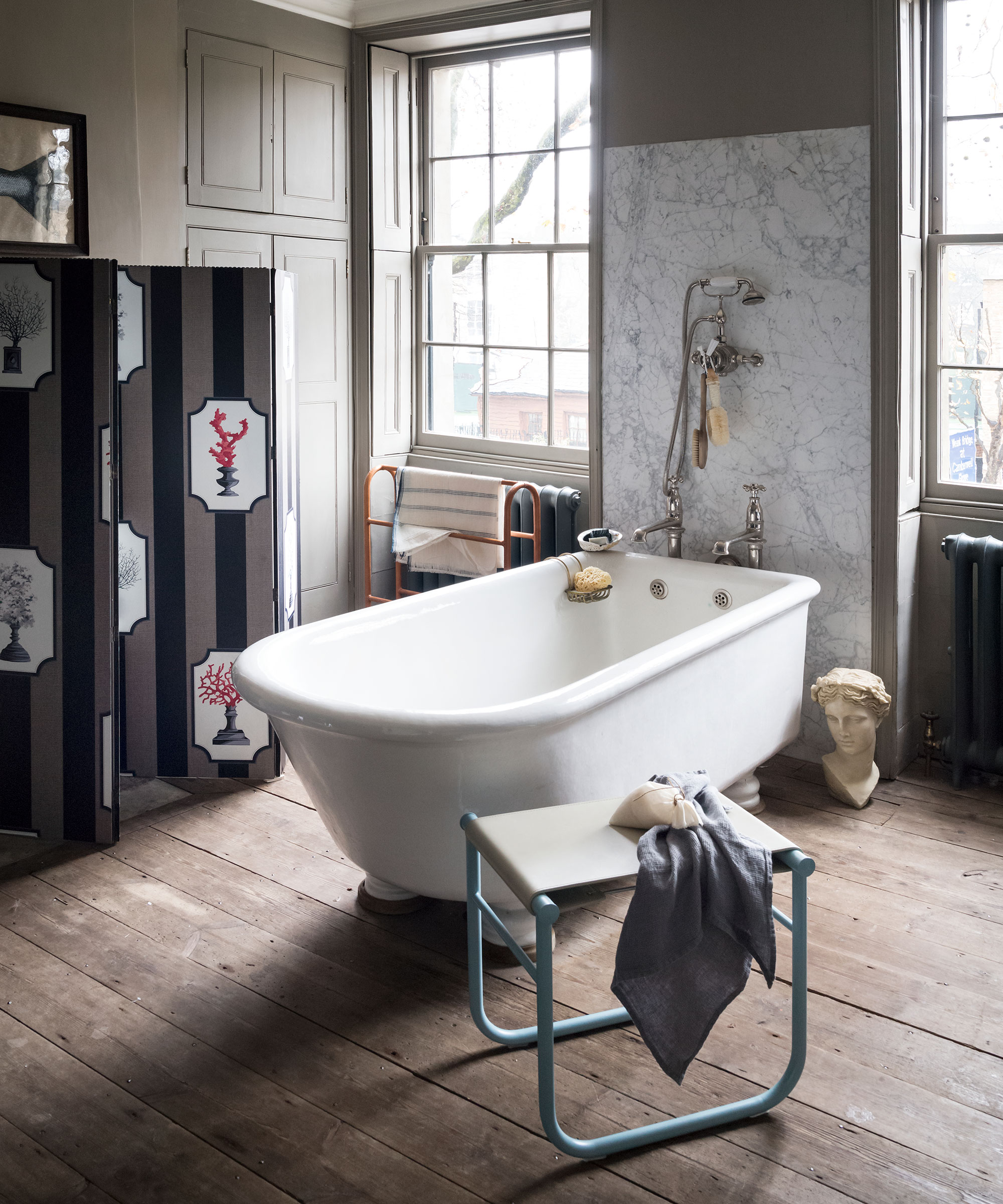 'Choosing a warmer tone,' such as Little Greene's Livid shade, pictured here on this Omnia bath, 'will stop the gray from feeling too cold,' he says.