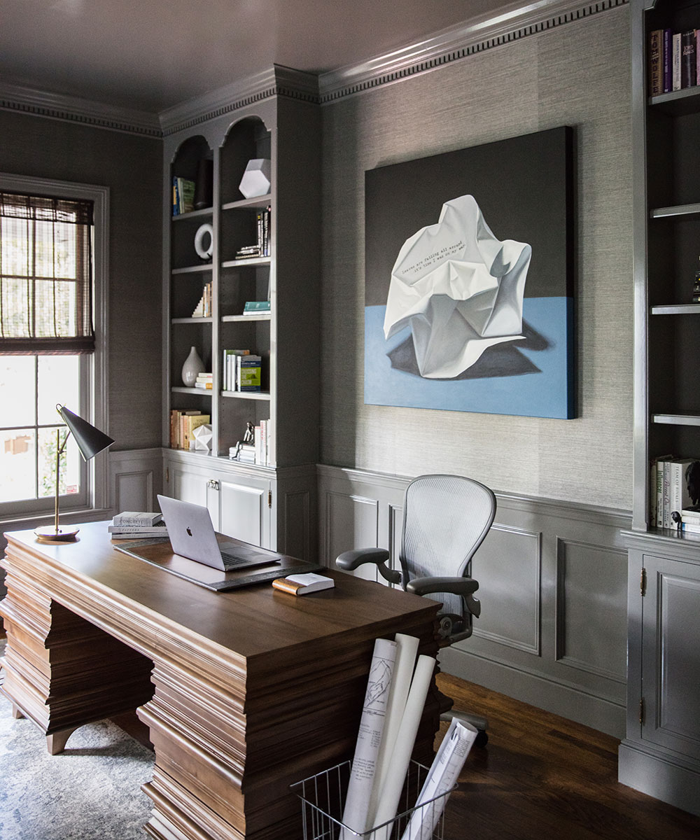 We gave this room a new life and created a rich textural space by lacquering the woodwork with Benjamin Moore’s 'Asphalt' and installing a coordinating Phillip Jeffires grasscloth wall-covering on the walls.