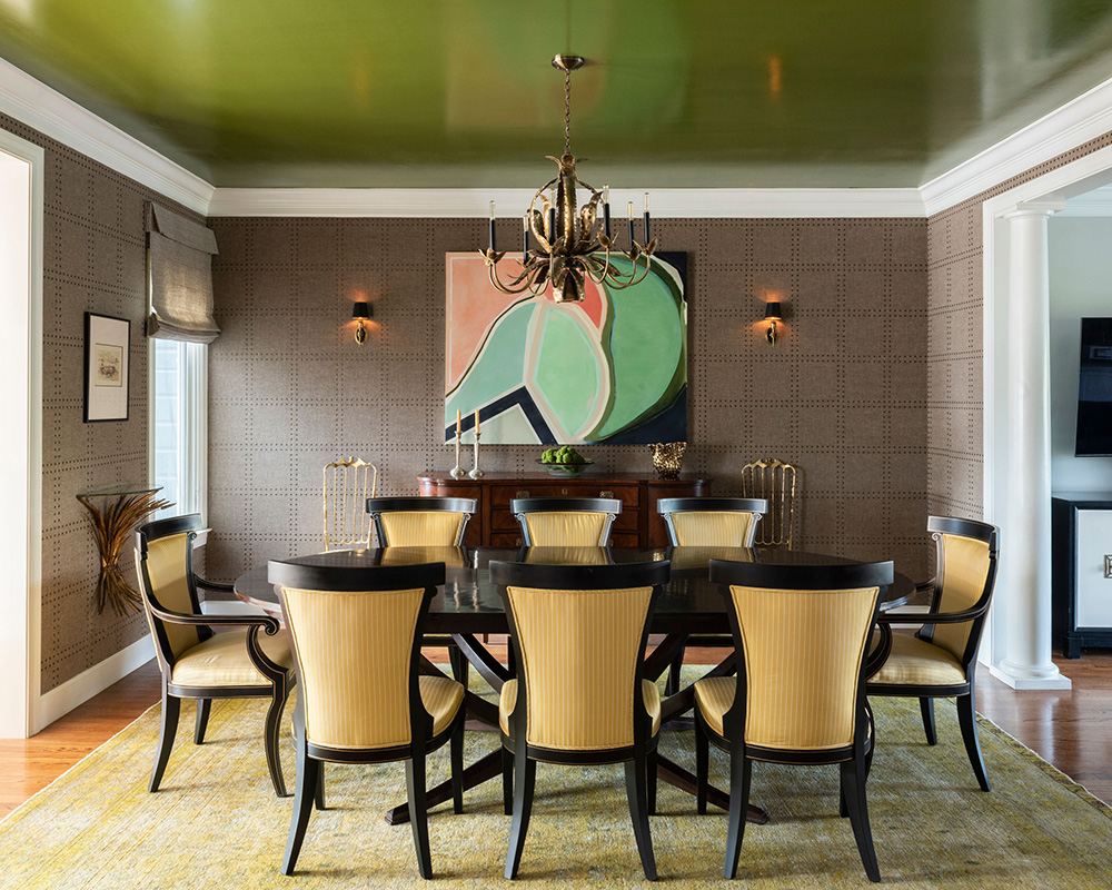 The dining room is a riot of colour. Paint is a great tool when you need to maximise the feeling of space in a small room. Layers of tonal colour and light-reflecting surfaces are an elegant counterpoint to a striking collection of art and fabric.